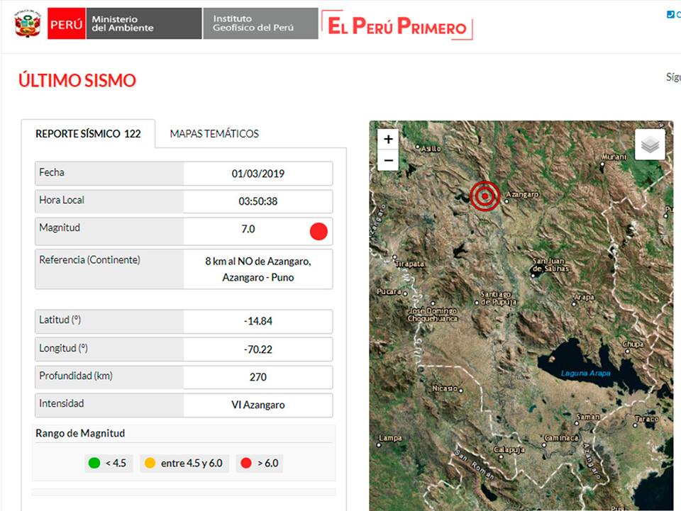 Un sismo de magnitud 7.0 se registró esta madrugada en la provincia de Azángaro, departamento de Puno, según el informe del Instituto Geofísico del Perú (IGP).