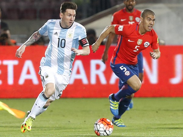 Chile arrancó bien, pero sufrió la rápida pérdida de Matías Fernández por lesión. En su lugar entró Francisco Silva para darle mayor marca en el mediocampo. A los 9′ Messi se inventó un jugadón que Di María mandó alto y Argentina empezaba a asustar el arco chileno. No obstante, La Roja reaccionó y rompió el cero al rato con un cabezazo de Felipe Gutiérrez.