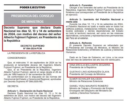 «De conformidad con lo dispuesto en las normas del Ceremonial del Estado y Ceremonial Regional, aprobadas por Decreto Supremo Nº 096-2005-RE, se decreta declarar Duelo Nacional los días 12, 13 y 14 de setiembre de 2024, con motivo del deceso del Ingeniero Alberto Fujimori , expresidente de la república», se detalló en el documento.