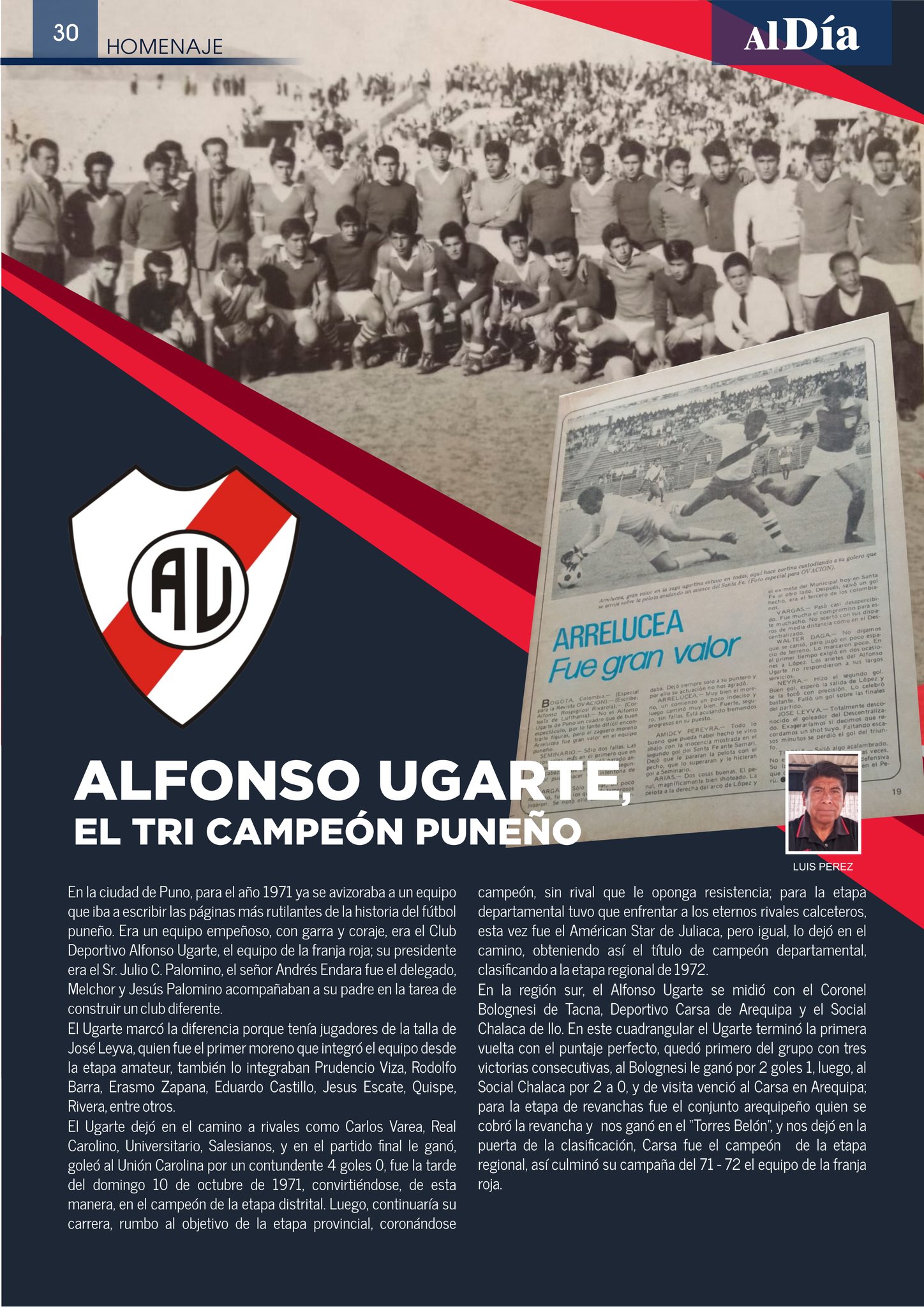 En 1971, el fútbol puneño vivía una de sus épocas más brillantes con la consolidación de un equipo que marcó historia: el Club Deportivo Alfonso Ugarte, conocido como “el equipo de la franja roja”. Con garra, entrega y amor por la camiseta, el conjunto ugartino inició una racha triunfal que lo consagró como tricampeón del fútbol puneño.