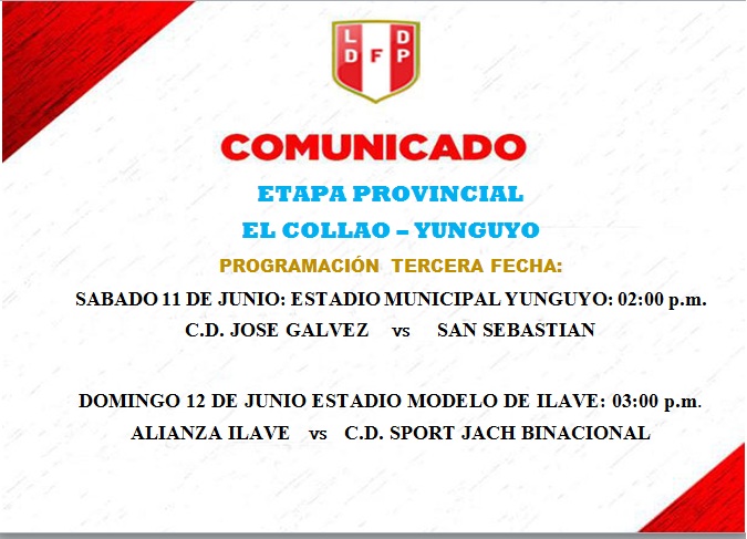 Para este domingo 12 de junio está programado la Copa Perú – Etapa provincial en Ilave, Alianza Ilave juega de local con Sport JACH Binacional de Mazocruz a las 15 horas.