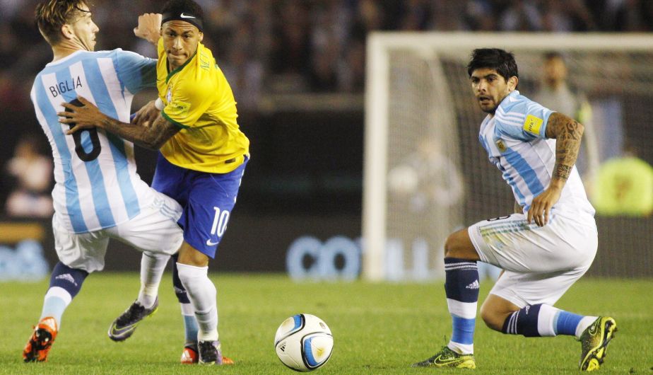 Neymar (C) of Brazil is tackled by Lucas Biglia of Argentina as Argentina's Ever Banega looks on during their 2018 World Cup qualifying soccer match in Buenos Aires, Argentina, November 13, 2015. REUTERS/Martin Acosta