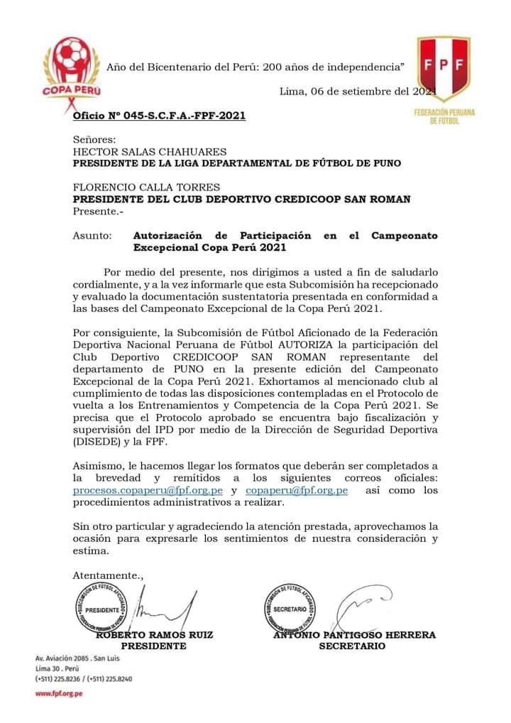 AUTORIZAN A CREDICOOP SAN ROMÁN PARTICIPAR EN LA COPA PERU EXCEPCIONAL 2021