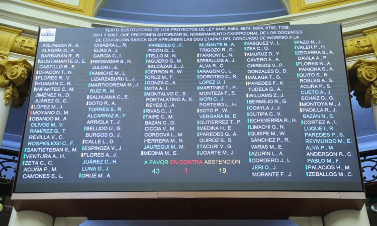 Con 47 votos a favor, 2 en contra y 19 abstenciones, el Pleno del Congreso aprobó el dictamen recaído en los proyectos de ley 6445/2023-CR, 6464/2023-CR, 6694/2023-CR, 6792/2023-CR, 7106/2023-CR y 7811/2023-CR, que autoriza al Ministerio de Educación el nombramiento excepcional de los docentes de la Educación Básica que aprueben dos etapas del concurso de ingreso a la Carrera Pública Magisterial.