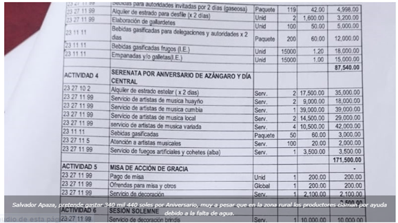 Según el plan de actividades, se planea destinar un total de 10 mil 400 soles en el concurso de belleza señorita azangarina; 25 mil 800 soles para difusión y publicidad; 87 mil 540 soles para el desfile cívico escolar; 171 mil 500 soles para la serenata por Aniversario de Azángaro y día central, que comprende la prestación de servicios de ocho artistas musicales.