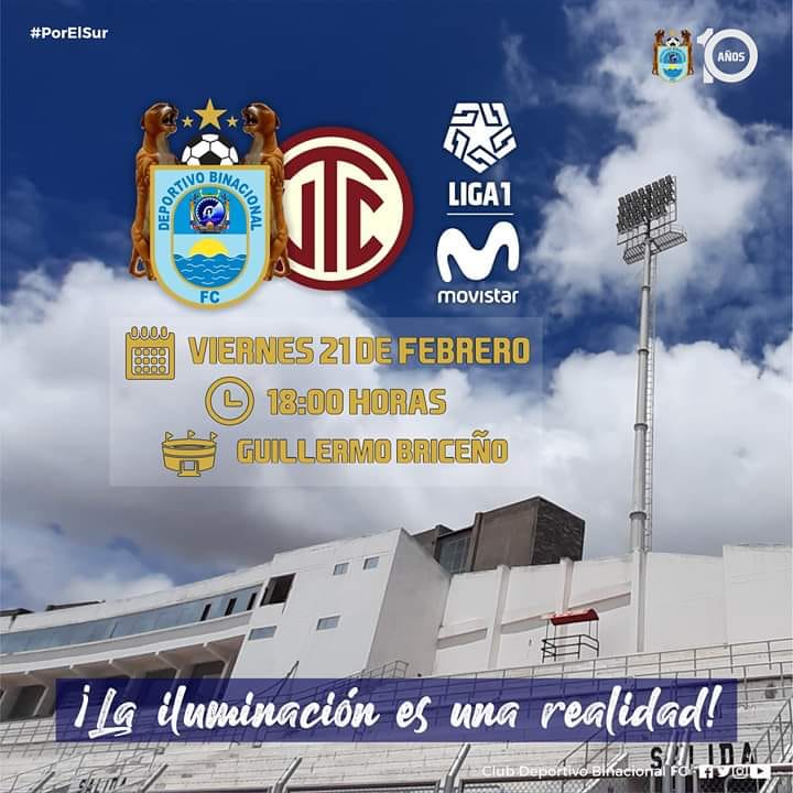 El Deportivo Binacional vive de cerca el sueño de jugar la Copa Libertadores en Juliaca. Este lunes la directiva del club anunció que las torres con luminarias que se instalaron durante las últimas semanas en el estadio Guillermo Briceño Rosamedina, ya se encuentran listas para ser inauguradas.