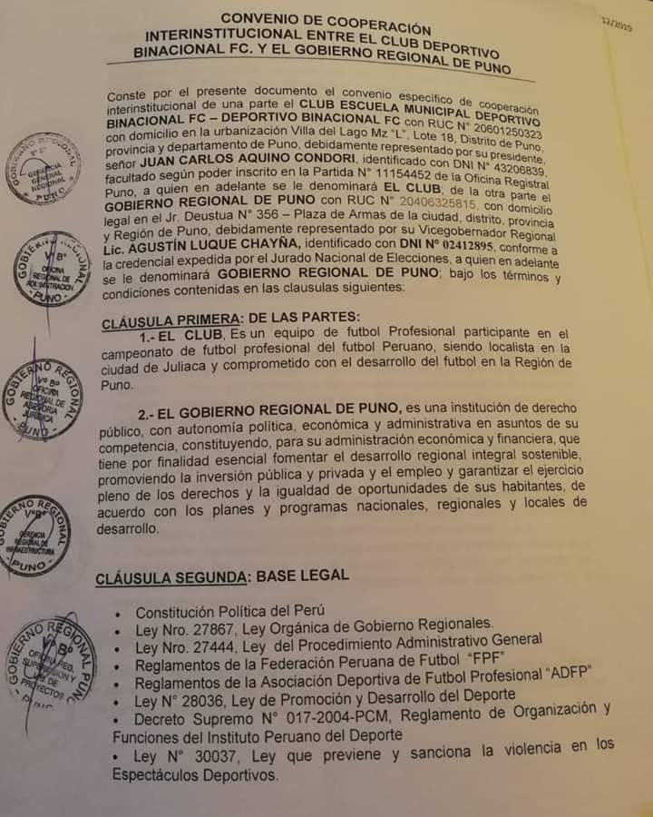 Éste es el documento que confirma el convenio entre Binacional y el Gobierno Regional de Puno para implementar las torres de luces en el Estadio Guillermo Briceño de Juliaca.