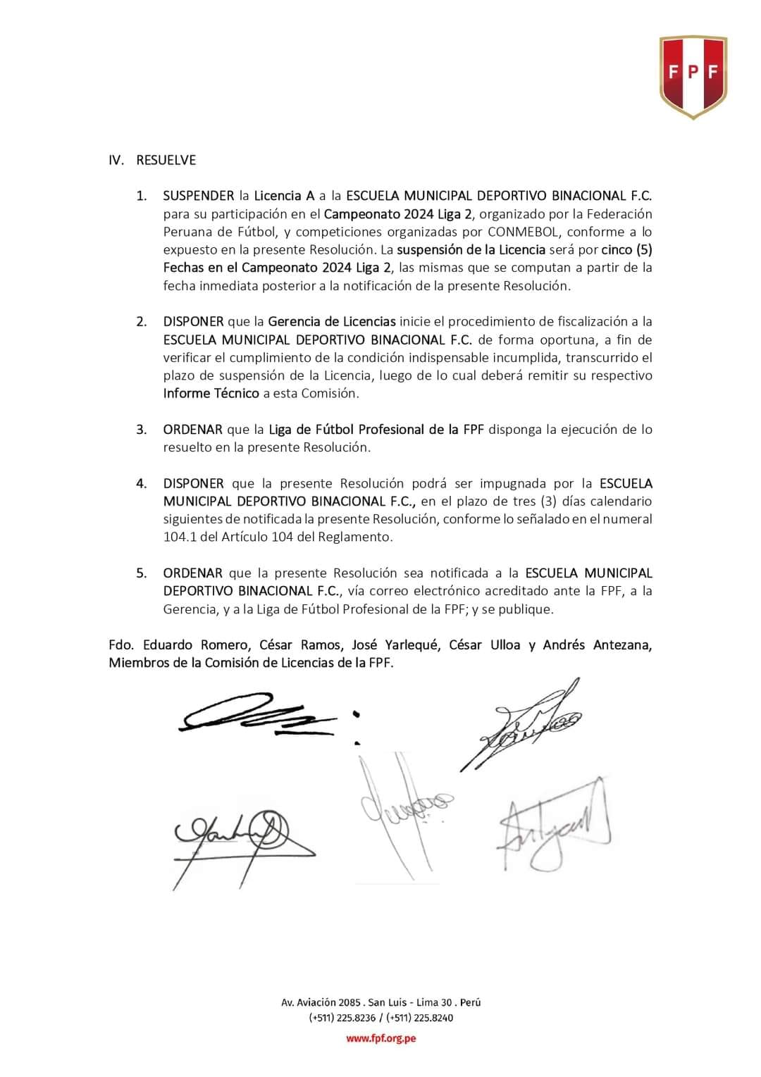 Además, le dieron 3 días para su descargo. De acuerdo a la Resolución N°072-CL-FPF – 2024 publicada el 11 de junio, el Deportivo Binacional no presentó la Declaración Jurada del Cumplimiento de Obligaciones Tributarias y Previsionales; que es uno de los requisitos adicionales para la obtención de Licencia del futbol profesional peruano.