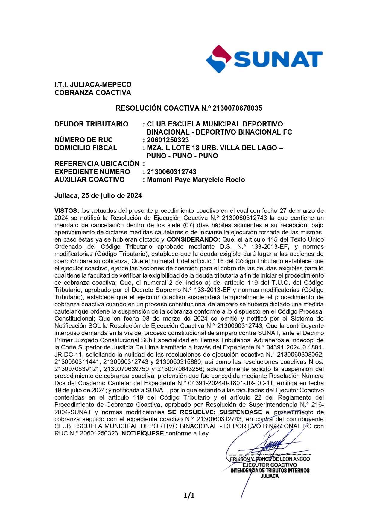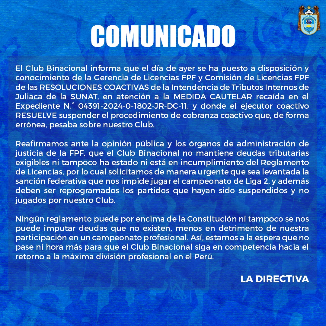 «El Club Binacional informa que el día de ayer se ha puesto a disposición y conocimiento de la Gerencia de Licencias FPF y Comisión de Licencias FPF de las resoluciones coactivas de la Intendencia de Tributos Internos de Juliaca de la SUNAT, en atención a la Medida cautelar recaída en el Expediente N° 04391-2024-0-1802-JR-DC-11, y donde el ejecutor coactivo resuelve suspender el procedimiento de cobranza coactivo que, de forma errónea, pesaba sobre nuestro Club», se deja leer en el comunicado.