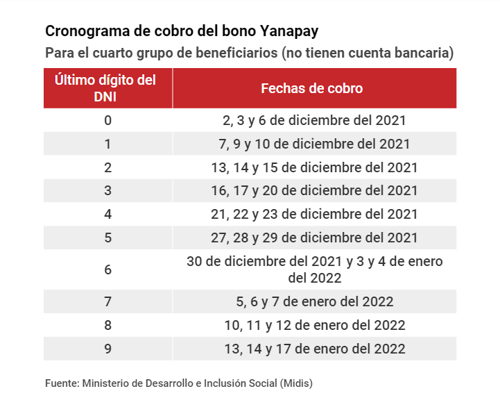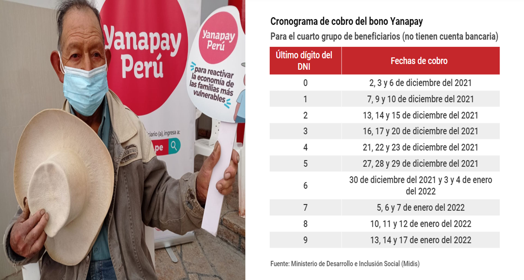 Desde el pasado 2 de diciembre se comenzó a pagar al cuarto grupo de beneficiarios del Bono Yanapay Perú de acuerdo con un cronograma establecido por el Ministerio de Desarrollo e Inclusión Social (Midis).