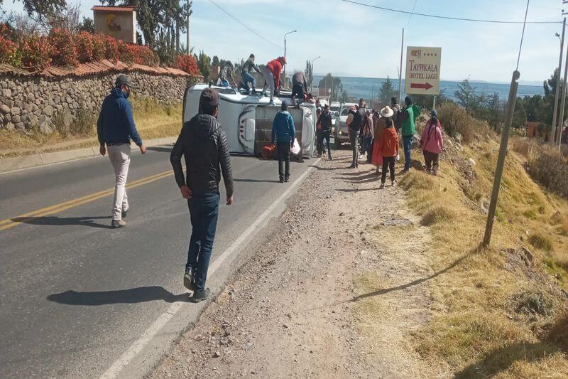 En medio de los gritos y la desesperación de los ocupantes de la combi, 4 de ellos fueron trasladados en un patrullero de la Comisaría de Chucuito que llegó al lugar y también en un auto particular que trasladó a algunos lesionados.