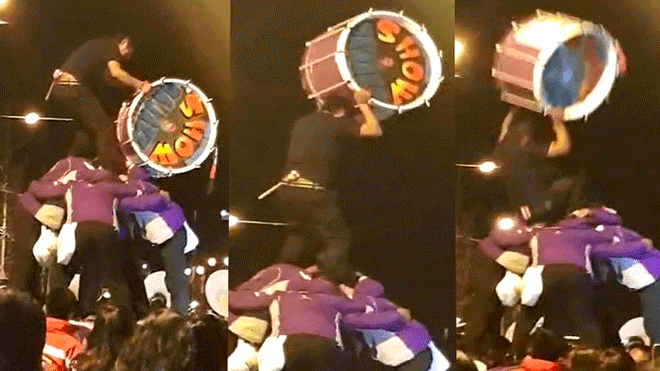 Los integrantes de esta agrupación intentaron formar una pirámidehumana donde el atractivo principal era ver al músico por lo alto tocando un bombo. Todo quedó registrado en un vídeo.