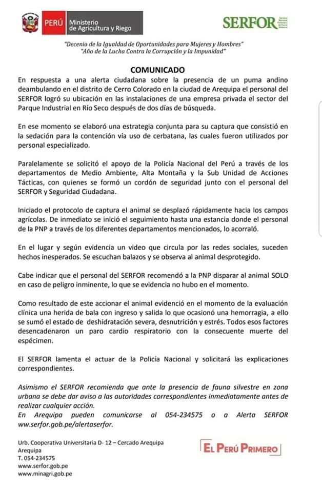 Un disparo realizado por la PNP hirió al animal silvestre de gravedad. El Serfor comunicó la triste noticia. Este hecho no debió ocurrir porque se dio instrucciones de no disparar a menos que haya peligro inminente. Una hemorragia, lo que se sumó a deshidratación severa, desnutrición y estrés ocasionaron un...