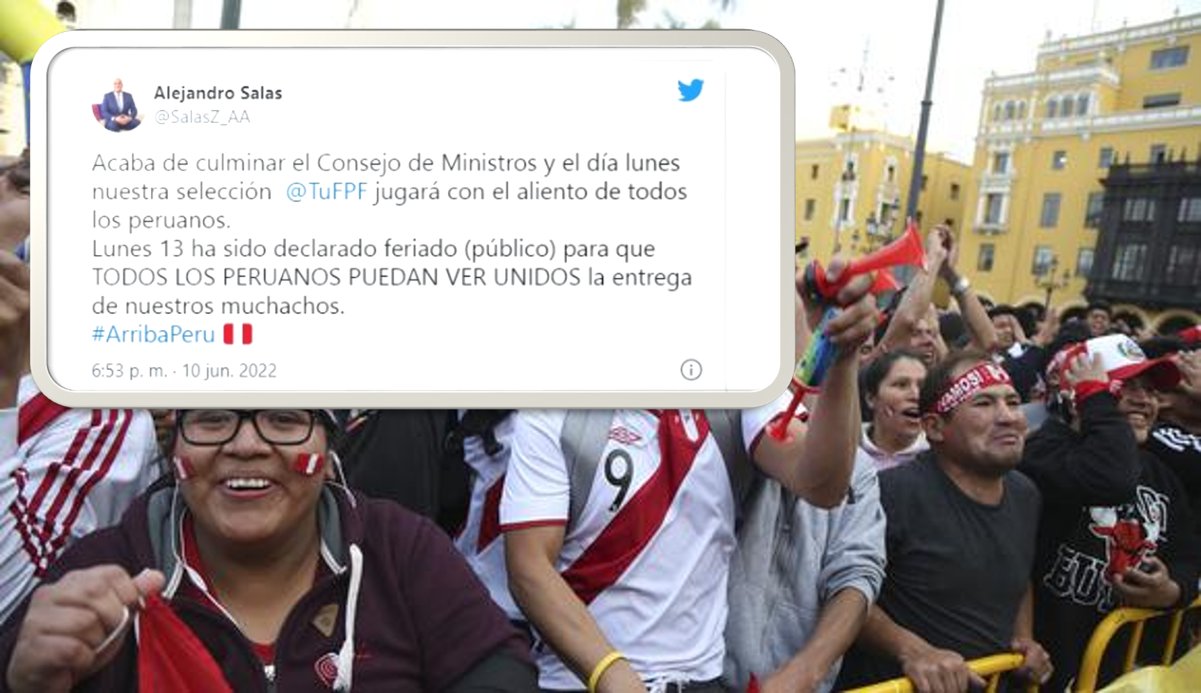La medida regirá todo el día, según acuerdo del Consejo de Ministros El Consejo de Ministros aprobó esta tarde declarar feriado nacional recuperable, para el sector público, el lunes 13 de junio con el fin que más peruanos puedan apreciar el partido de repechaje Perú vs. Australia por un cupo...