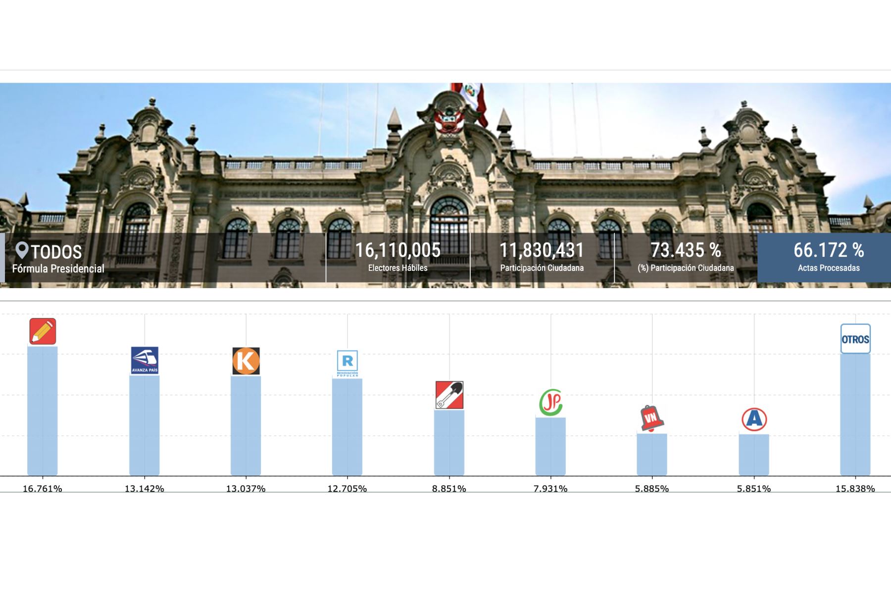 ONPE AL 66.172%: CASTILLO 16.76%, DE SOTO 13.14%, FUJIMORI 13.03%, LÓPEZ ALIAGA 12.70%