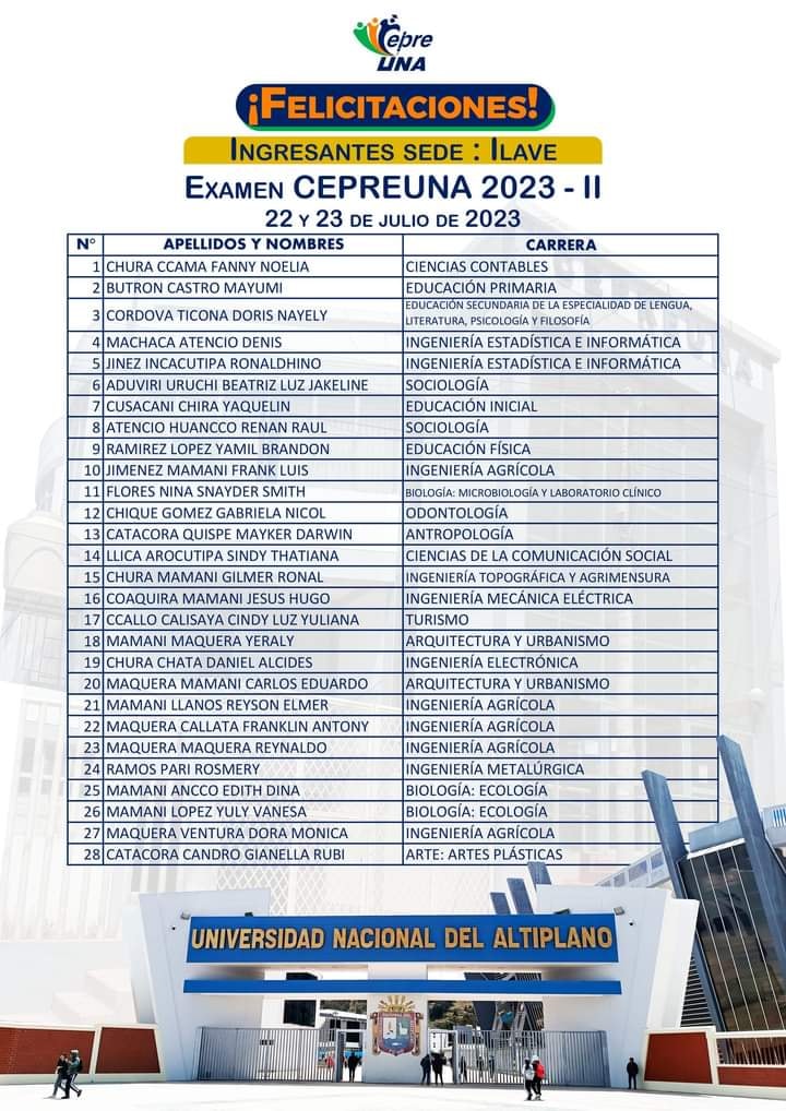 El CEPREUNA-Sede Ilave obtuvo un gran éxito al lograr 28 nuevos ingresantes a la Universidad Nacional del Altiplano (UNA) de Puno, superando a otras sedes.
