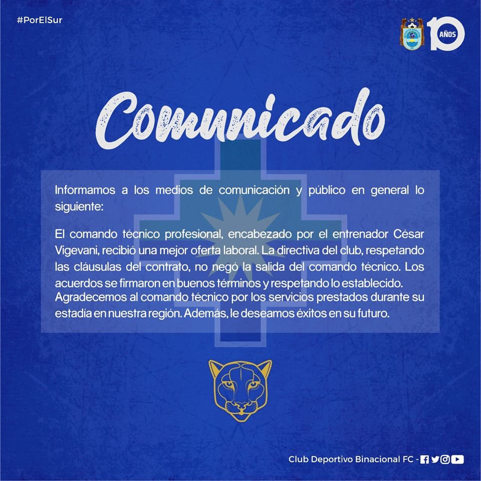 A poco de haber firmado como director técnico de Deportivo Binacional en Juliaca, el argentino César Vigevani no seguirá más en el puesto que asumió en enero de este año para la temporada 2020.