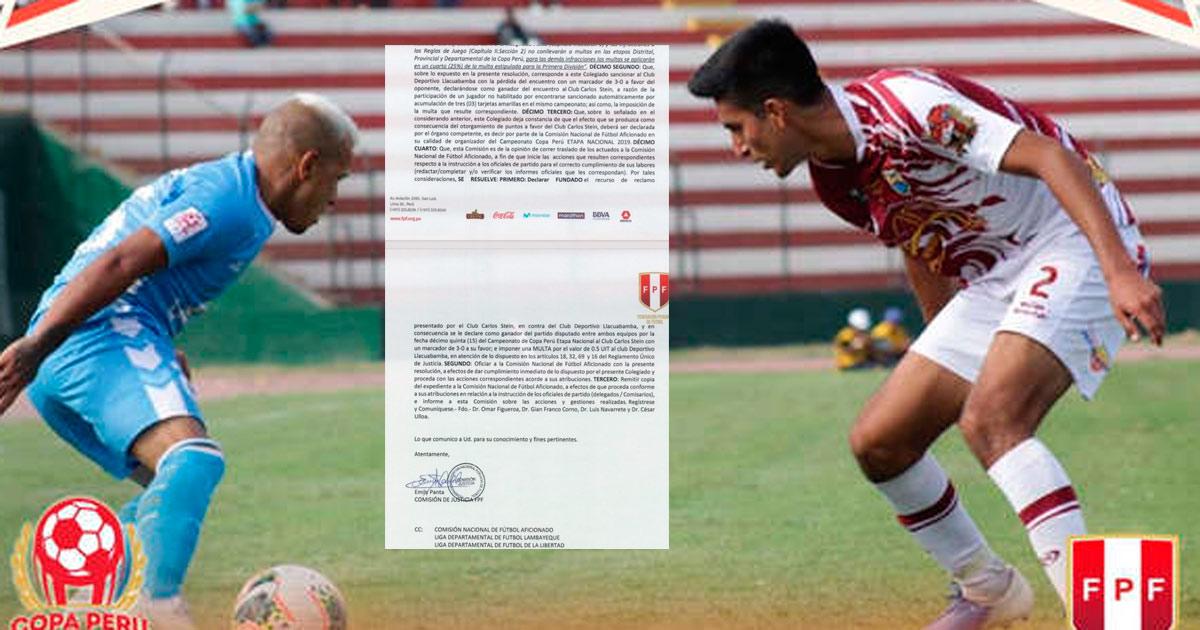 Carlos Stein le quitó el título de la Copa Perú al Deportivo Llacuabamba luego de que la Comisión de Justicia de la Federación Peruana de Fútbol (CJ-FPF) declarara fundado su reclamo. Deportivo Llacuabamba puede apelar.
