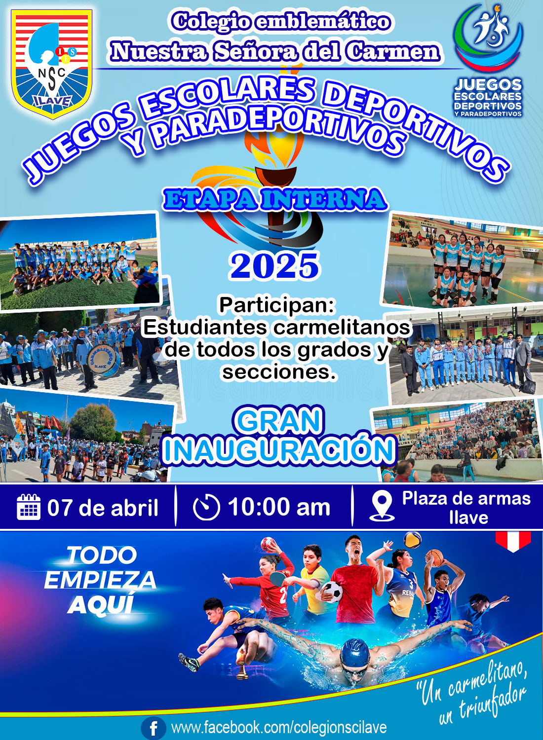 El Colegio Emblemático Nuestra Señora del Carmen de Ilave dará inicio este lunes 7 de abril a los Juegos Escolares Deportivos y Paradeportivos – Etapa Interna 2025, un evento que reunirá a estudiantes de todos los grados y secciones en diversas disciplinas deportivas.