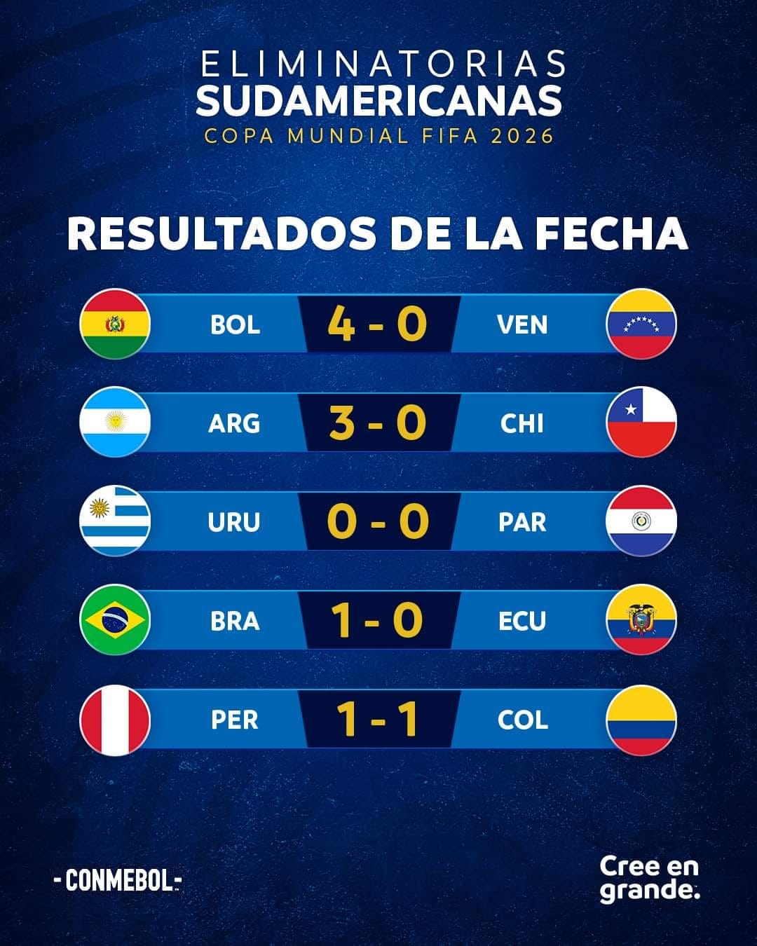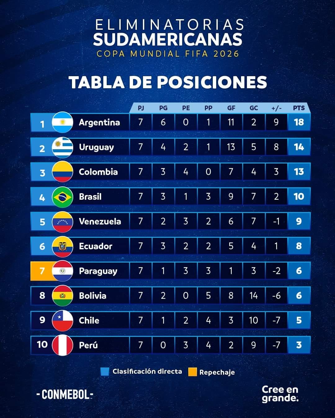 Las Eliminatorias Sudamericanas rumbo al Mundial 2026 volvieron a la acción después de realizarse la Copa América. En la séptima fecha del certamen, Argentina se consolidó como el líder de la clasificación, Bolivia se metió a la pelea por el repechaje, Brasil recuperó posiciones y hubo empates en Montevideo y Lima.