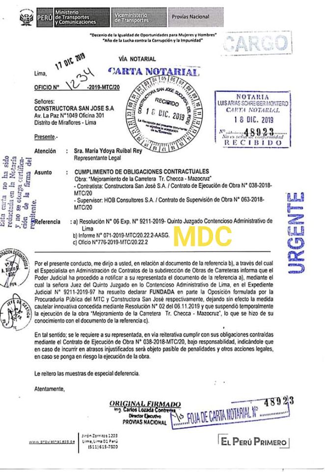 MTC ya curso Carta Notarial a la Empresa Constructora San José por incumplir con sus obligaciones contraídas mediante el contrato de ejecución de la obra nº 038-2018-MTC/20, bajo responsabilidad, indicándole que en caso de incurrir en atrasos injustificados será objeto de penalidades y otras acciones legales en caso ponga en riesgo la ejecución de obra.