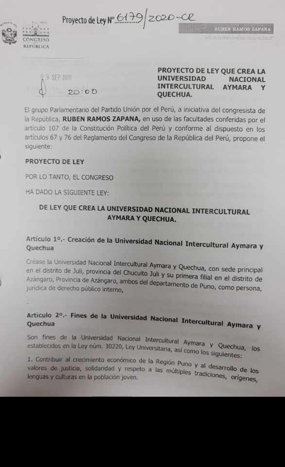 El día 11 de setiembre, el congresista por la región Puno Rubén Ramos Zapana presentó el proyecto de Ley N° 6179 Ley de Creación de la Universidad Nacional Intercultural Aimara y quechua con sede en la ciudad de Juli y con filial en la ciudad de Azángaro.
