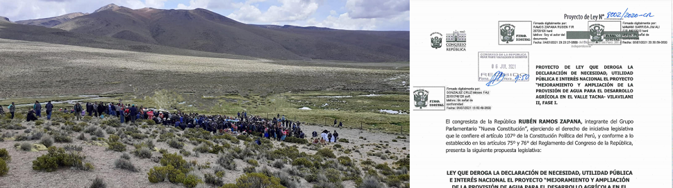 El parlamentario puneño Rubén Ramos Zapana ayer presentó El proyecto de ley que deroga la declaración de necesidad, utilidad pública e interés nacional el proyecto “MEJORAMIENTO Y AMPLIACIÓN DE LA PROVISIÓN DE AGUA PARA EL DESARROLLO AGRICOLA EN EL VALLE TACNA- VILAVILANI II, FASE I.