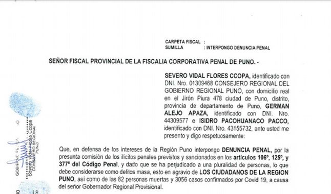 El documento detalla que, los casos de coronavirus se incrementaron en dicha localidad, “situación que al gobernador regional de Puno le es indiferente, exponiendo a los ciudadanos a peligro al no prever y tomar las medidas necesarias para la protección de la salud, deber que le corresponde como máxima autoridad de la región”.