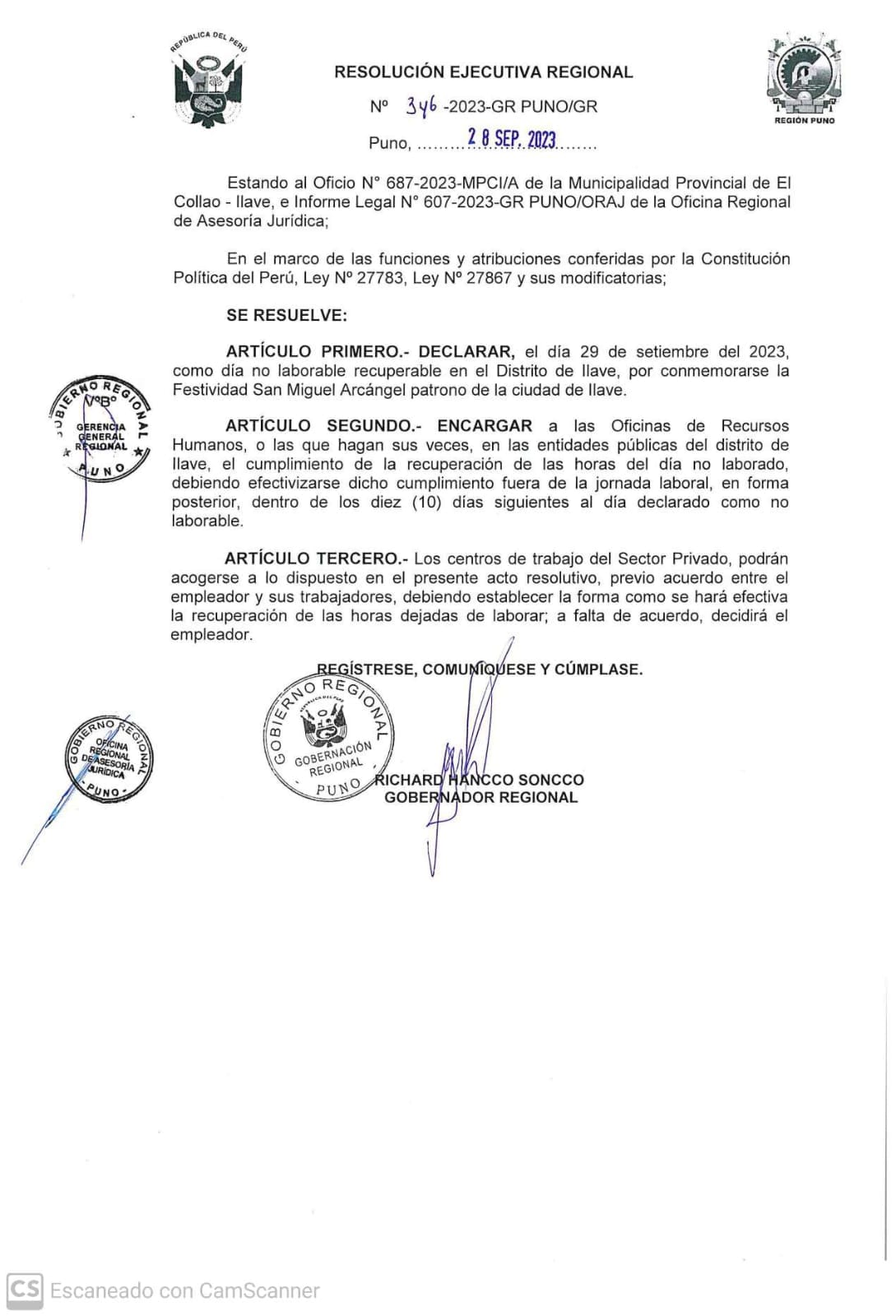 Mediante la resolución Ejecutiva Regional Nº 346 2023 GR PUNO/GR con fecha 28 de setiembre, se ha declarado feriado local en el distrito de Ilave por la festividad de San Miguel Arcángel. Esta festividad es conmemorada el 29 de setiembre del 2023 y será considerado como día no laborable recuperable.