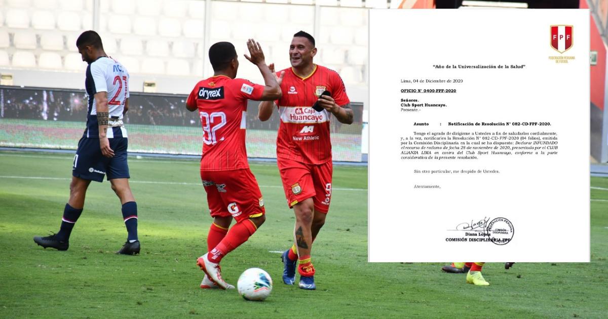 En su resolución, dicha Comisión «declara INFUNDADO el recurso de reclamo de fecha 28 de noviembre de 2020, presentado por el Club Alianza Lima en contra del Club Sport Huancayo, conforme a la parte considerativa de la presente resolución».