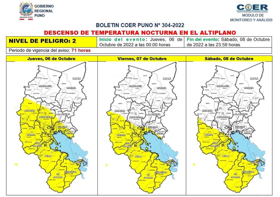 El Gobierno Regional de Puno, a través del Centro de Operaciones de Emergencia Regional del Gobierno Regional de Puno, informa que desde el jueves 06 al sábado 08 de octubre del presente año, la intensidad del frío durante la noche y madrugada alcanzará valores de hasta -16 °C, en localidades por encima de los 4000 m.s.n.m., de acuerdo al Aviso Meteorológico Nro. 201 del SENAMHI.