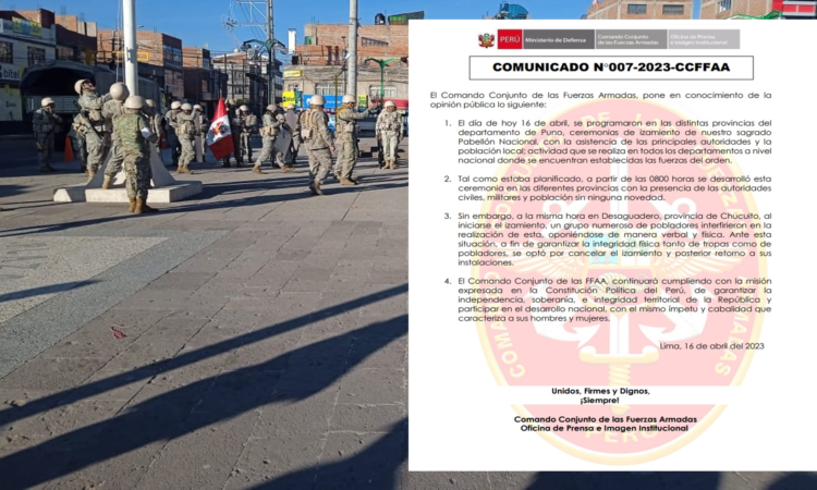 El Comando Conjunto de las Fuerzas Armadas informó que canceló la mañana de este sábado el izamiento del Pabellón Nacional en la plaza de armas de Desaguadero a fin de garantizar la integridad física de las tropas y pobladores tras una interferencia de un «grupo numeroso» durante la actividad.