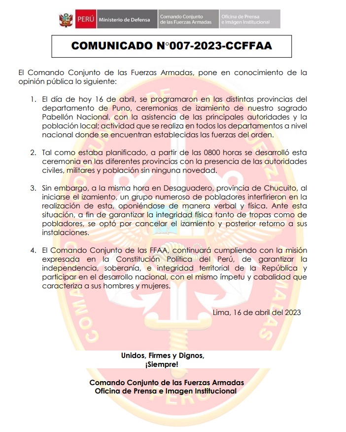 El Comando Conjunto de las Fuerzas Armadas informó que canceló la mañana de este sábado el izamiento del Pabellón Nacional en la plaza de armas de Desaguadero a fin de garantizar la integridad física de las tropas y pobladores tras una interferencia de un «grupo numeroso» durante la actividad.