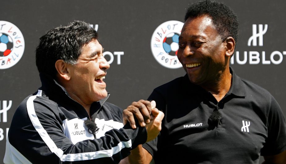 Football legends Pele (R) and Diego Maradona attend an advertising soccer event on the eve of the opening of the UEFA 2016 European Championship in Paris, France, June 9, 2016. REUTERS/Charles Platiau