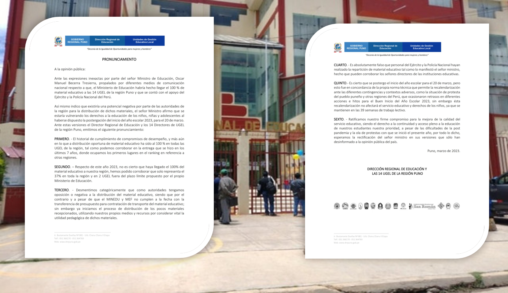 La Dirección Regional de Educación de Puno (DREP) y las 14 Unidades de Gestión Educativa Local (UGELs) desmienten al ministro de Educación (MINEDU), Oscar Manuel Becerra Trasierra, al anunciar que se habría entregado el 100% de material educativo con el apoyo del Ejército y la Policía Nacional, lo cual fue categóricamente desmentido.