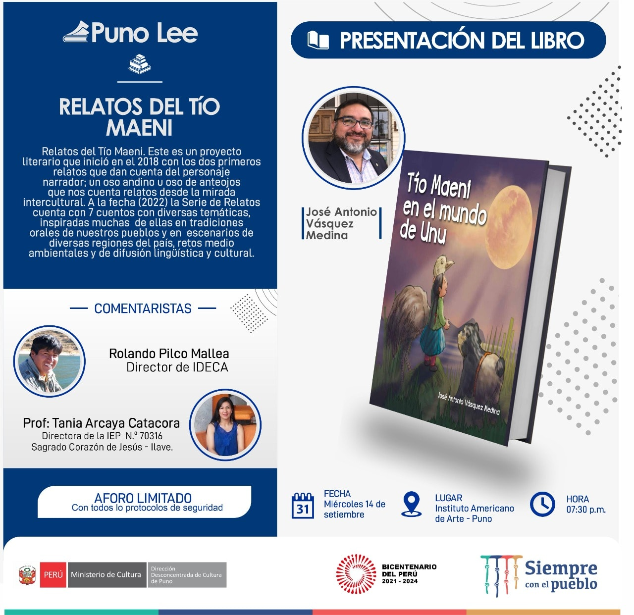 José Antonio Vásquez Medina es un escritor peruano, educador y conferencista creador de «Los relatos del tío Maeni», en diálogo con Radio Excelente, sostuvo que este 14 de setiembre, presentará en la Institución Educativa Primaria N° 70316 Sagrado Corazón de Jesús, tras tener una coordinación con la directora Tania Arcaya Catacora de la mencionada institución educativa.