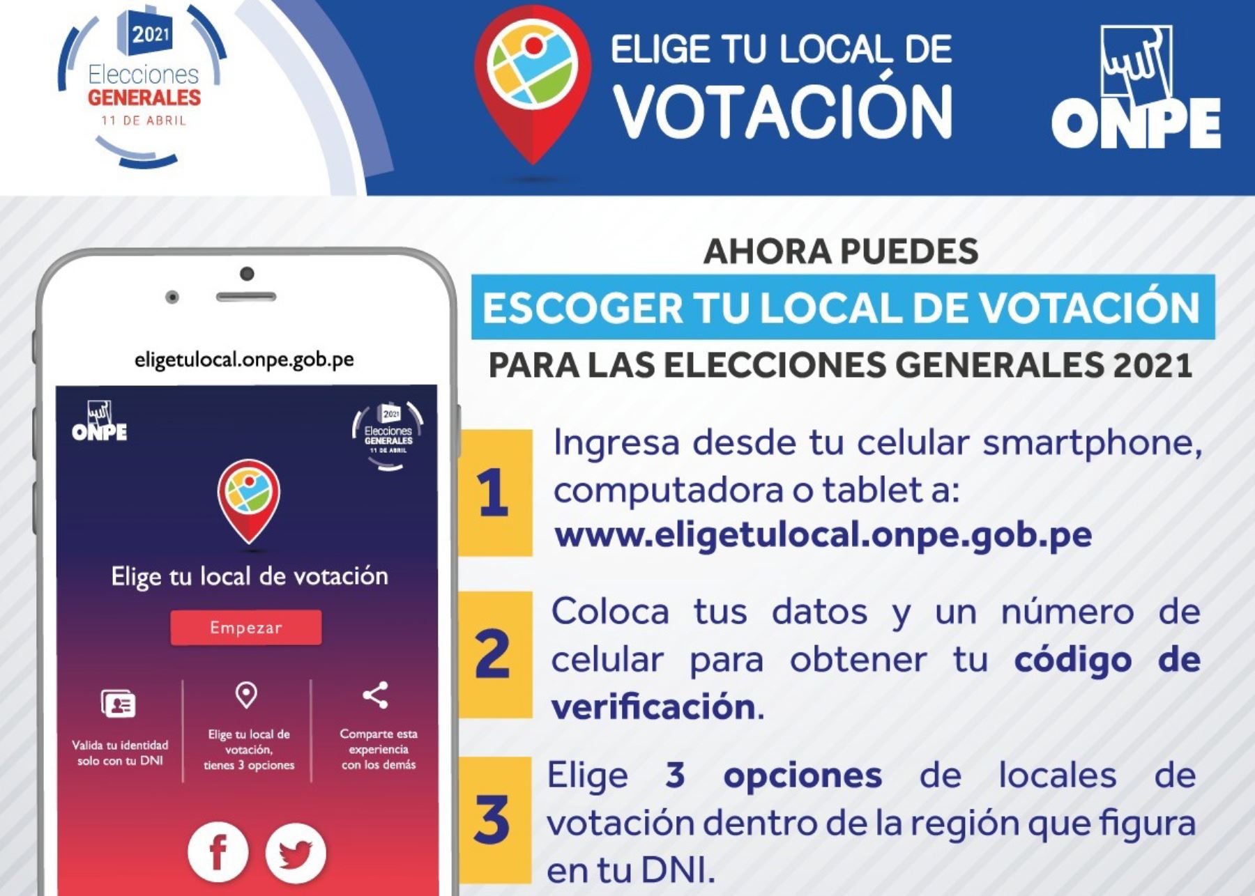 La Oficina Nacional de Procesos Electorales (ONPE) puso a disposición de los más de 24 millones de electores una plataforma que les permite elegir su local de votación más cercano al domicilio para sufragar en los comicios generales del 11 de abril.