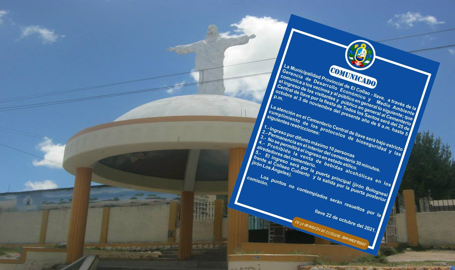 La Gerencia de Desarrollo Económico y Medio Ambiente dela MPCI, comunica a los vecinos y al público en general lo siguiente; que el ingreso de los visitantes y público en general al Cementerio Central de Ilave por la fiesta de Todos los Santos será del 25 de octubre al 3 de noviembre del presente año de 6 a.m. hasta 5 p.m.