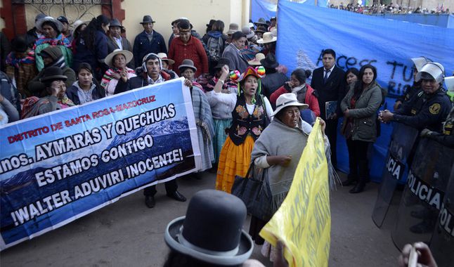 Un fuerte contingente policial resguarda la movilización en la que participan comuneros, dirigentes, y el excongresista Jorge Rimarachín, a espera de oír la lectura de sentencia contra Aduviri. Luego de ello, se reunirán para evaluar la fecha para convocar lo que denominan el “segundo Aymarazo”.