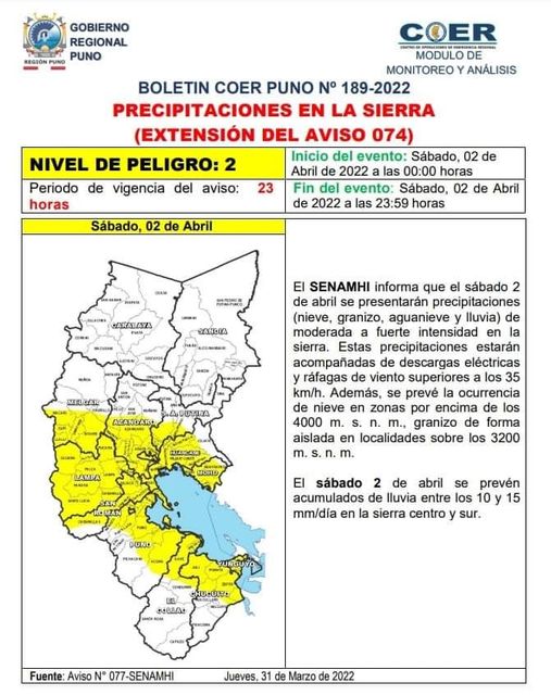 Desde el Centro de Operaciones de Emergencia Regional – COER Puno, se pone de conocimiento de la población y autoridades que, hasta las cero horas de este sábado 02 de abril, se anuncia la presencia de lluvias de moderada intensidad.