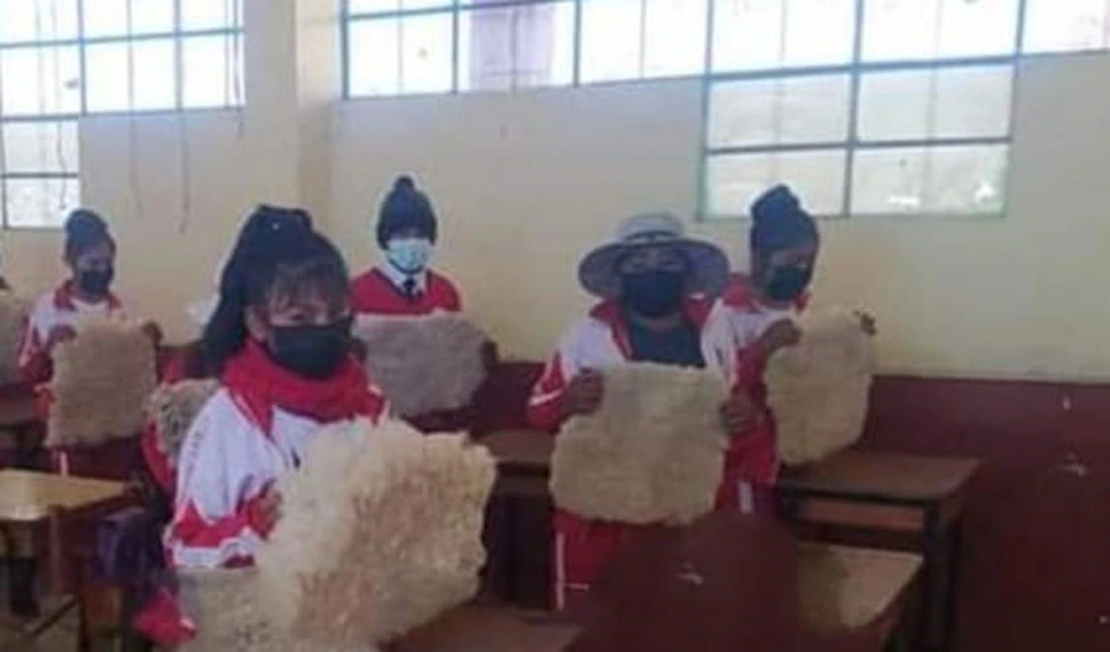 Los menores junto a sus padres cortaron parte del cuero de una oveja con lana y la adecuaron como un cojín. Previamente, pasó por un proceso de lavado y secado. Llevaron el producto a sus salones y estos se colocaron en los asientos para recibir las lecciones de aprendizaje sin estar incómodos por las bajas temperaturas.