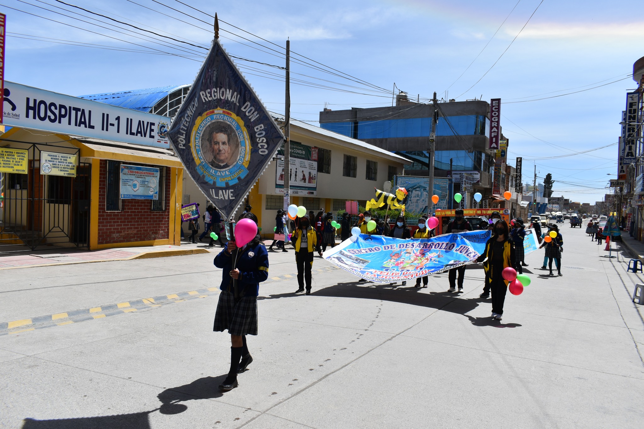 Con participación de estudiantes de la Institución Educativa Politécnico Don Bosco, personal de salud del C.S Metropolitano, Micro Red Ilave y Red de Salud El Collao, se realizó la marcha de sensibilización con pancartas alusivas al Día de la Juventud, Día de la Primavera y la semana de Prevención de embarazo en adolescentes, por las principales arterias de la ciudad de Ilave, amenizado por la banda de estudiantes de Politécnico Don Bosco.