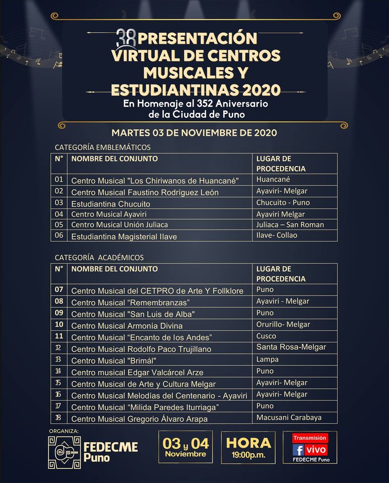 En homenaje a los 352 aniversario de la ciudad de Puno, la Federación Departamental de Centros Musicales y Estudiantinas de Puno (FEDECME) organiza la XXXVIII Presentación Virtual de Centros Musicales y Estudiantinas 2020.