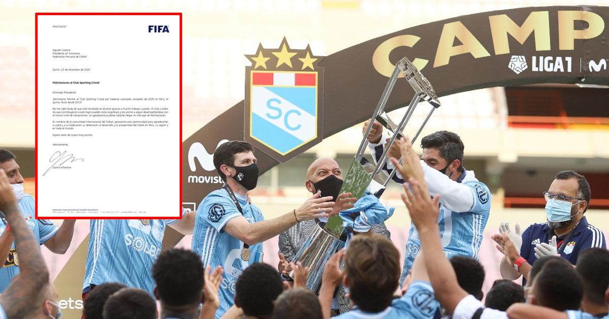 Mediante una carta enviada a la Federación Peruana de Fútbol, el presidente de la FIFA, Gianni Infantino, felicitó al club Sporting Cristal luego de coronarse campeón de la Liga 1 Movistar 2020.