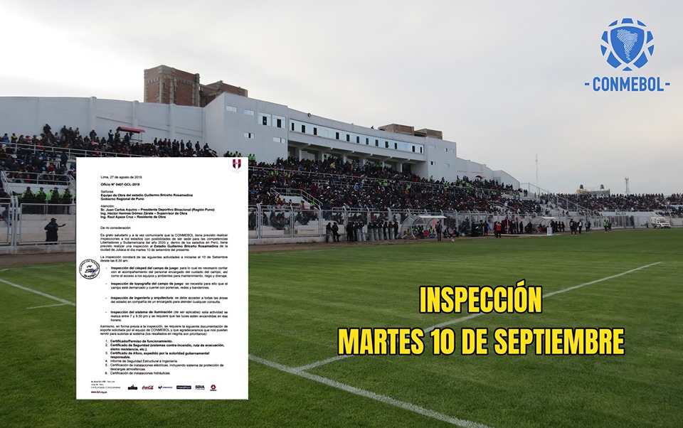 Según el oficio N°0407-GCL-2019, que fue remitido por el gerente de licencias de la FPF, Hernán Garvan Valderrama, indica que los miembros de la Conmebol verificarán primero el estadio de Juliaca el martes 10 de setiembre y al día siguiente estarán en Puno.