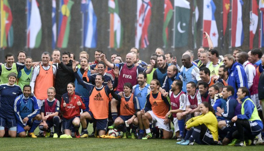 El recientemente elegido presidente de la FIFA, Gianni Infantino, se puso un uniforme deportivo y disputó un partido de fútbol amistoso con estrellas del balompié como Deco y Figo.