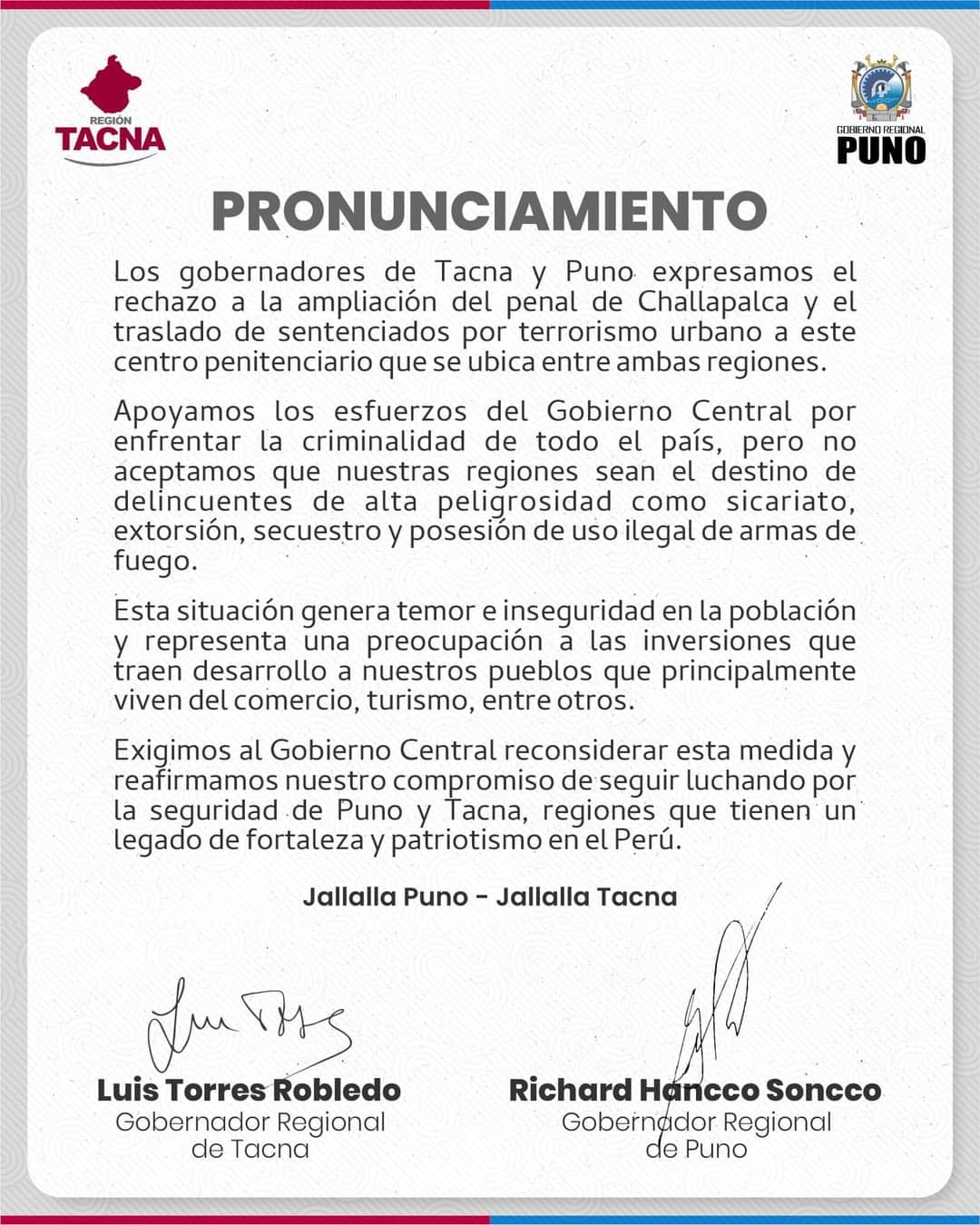 Los gobernadores de Tacna y Puno, Luis Torres Robledo y Richard Hancco Soncco, rechazaron la ampliación del penal de Challapalca y el traslado de sentenciados por terrorismo urbano a este centro penitenciario. Los funcionarios expresaron su preocupación por la seguridad de sus regiones, argumentando que estas no son aptas para albergar a delincuentes de alta peligrosidad.