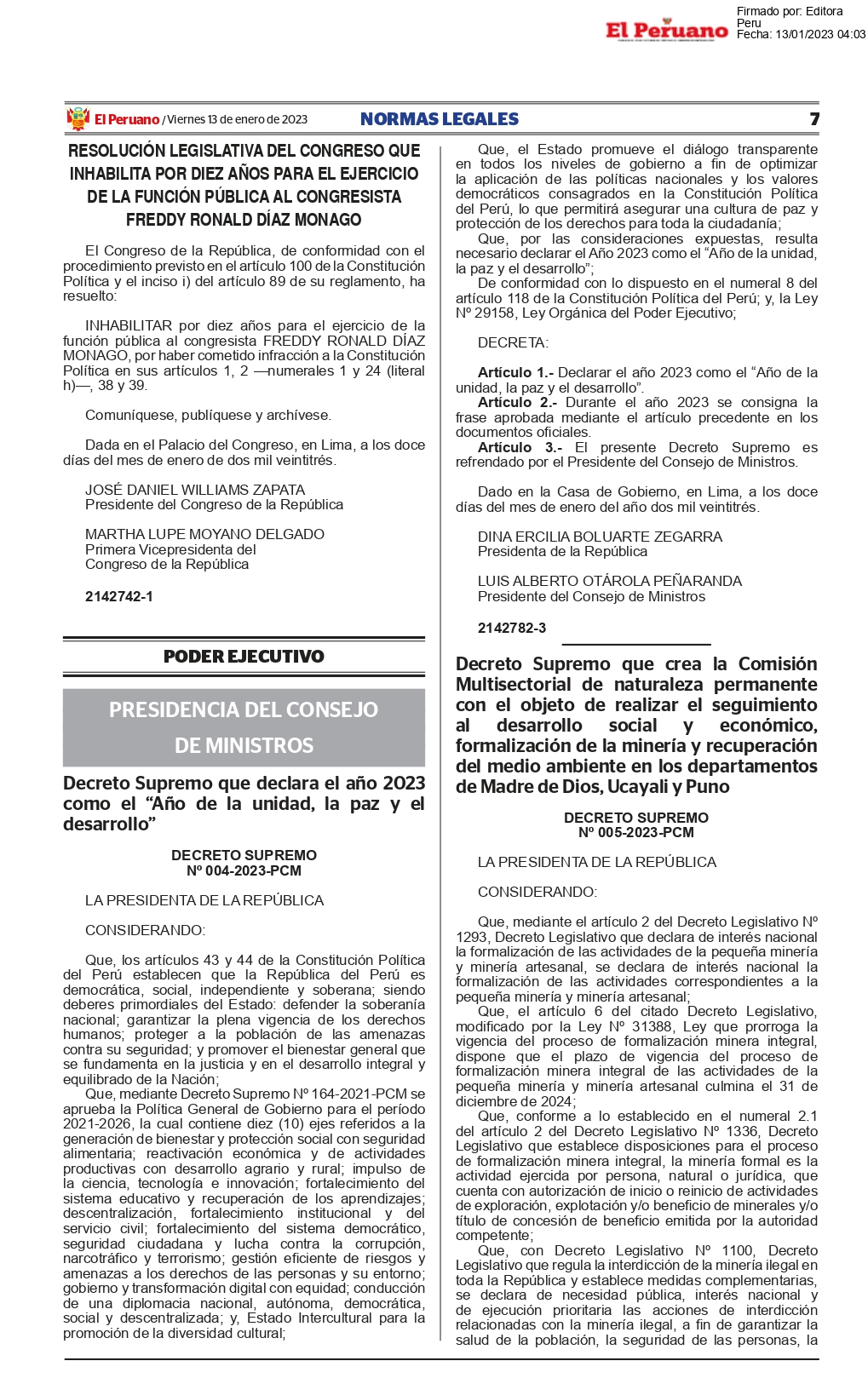 El dispositivo cuenta con el refrendo de la presidenta de la República, Dina Boluarte; y el titular del Consejo de Ministros, Luis Otárola.