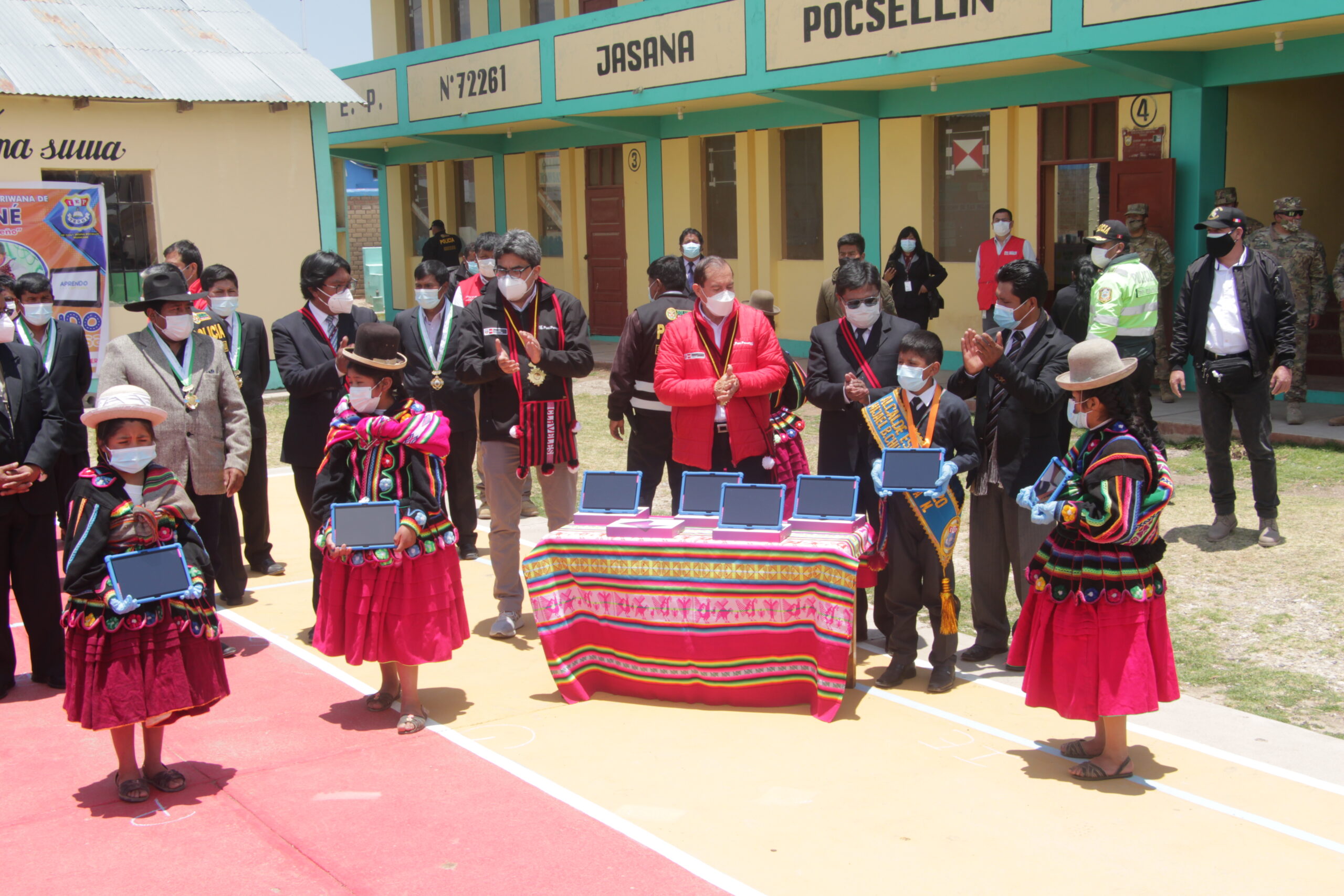 Con la llegada del Primer Ministro Walter Martos Ruiz, el Ministro de Educación Martin Benavides Abanto en compañía del Gobernador Regional Agustín Luque y el Director Regional de Educación Puno Mario Benavente se hizo la entrega de tablets a alumnos de la I.E. Primaria Nº 72261 Jasana Pocsellin del distrito de Taraco en la provincia de Huancané.