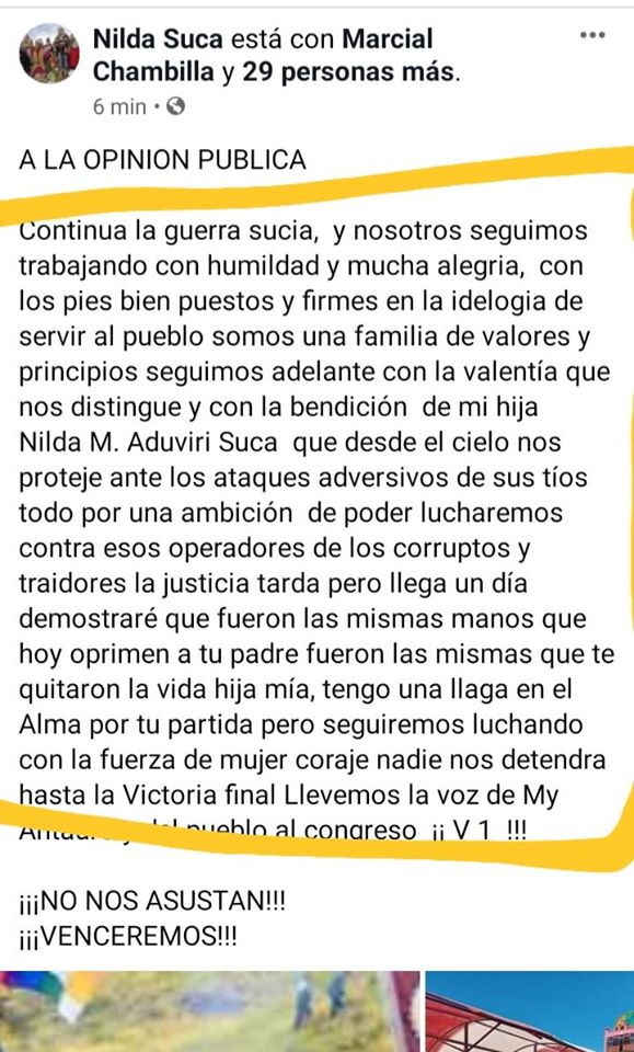 Continua la guerra sucia, y nosotros seguimos trabajando con humildad y mucha alegria, con los pies bien puestos y firmes en la idelogia de servir al pueblo somos una familia de valores y principios seguimos adelante con la valentía que nos distingue y con la bendición de mi hija Nilda M. Aduviri Suca que desde el cielo nos proteje ante los ataques adversivos de sus tíos todo por una ambición de poder lucharemos contra esos operadores de los corruptos y traidores la justicia tarda pero llega un día demostraré que fueron las mismas manos que hoy oprimen a tu padre fueron las mismas que te quitaron la vida hija mía, tengo una llaga en el Alma por tu partida pero seguiremos luchando con la fuerza de mujer coraje nadie nos detendra hasta la Victoria final Llevemos la voz de My Antauro y del pueblo al congreso ¡¡ V 1 !!! ¡¡¡NO NOS ASUSTAN!!! ¡¡¡VENCEREMOS!!!